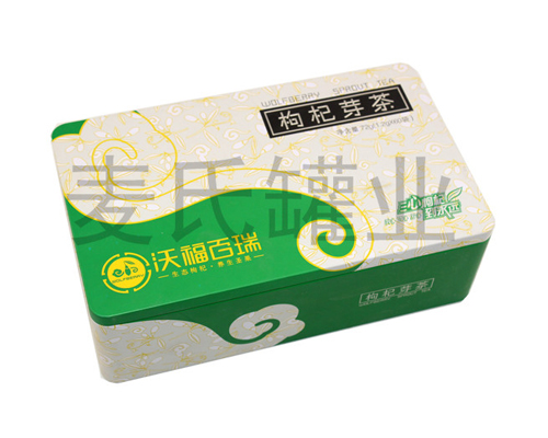 枸杞芽茶鐵盒,寧夏枸杞葉茶馬口鐵盒,采用單面1專色+四色印刷工藝制作,外過(guò)水性亮光油,內(nèi)過(guò)金油油,鐵盒整體為蓋、身、底印刷處理。此款鐵盒為200*90*83mm的規(guī)格尺寸,可包裝720g的枸杞芽茶,可選擇大容量的包裝需求。