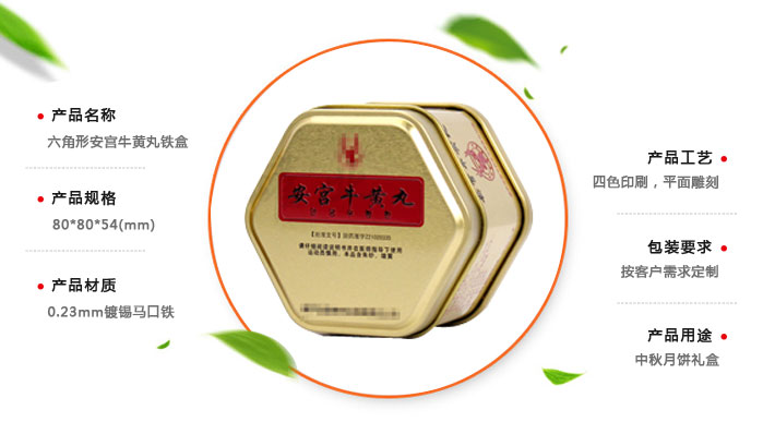 六角形安宮牛黃丸鐵盒,是用來包裝存放安宮牛黃丸的一種金屬包裝鐵盒,印刷美觀,適宜保存,批發價格低,麥氏罐業可定制各種尺寸相關六角形安宮牛黃丸鐵盒,是牛黃丸包裝盒生產加工廠家。